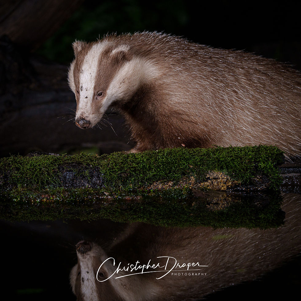 Roughly twenty minutes later, another erythristic badger appeared — perhaps even the same one returning — and stayed a little longer to feed on the peanuts scattered around the set. I managed to capture a few lovely shots, including one of it drinking from the pool, the lighting catching the warm tones of its coat perfectly.